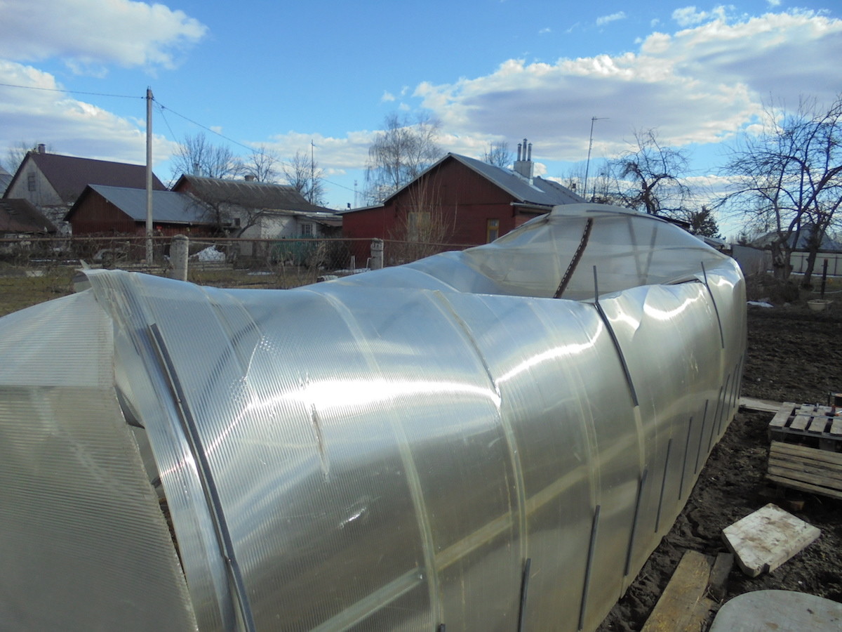 Толщина не менее 4 мм. Мы рекомендуем приобретать теплицы с поликарбонатом повышенной прочности 0.7 кг/кв.м.